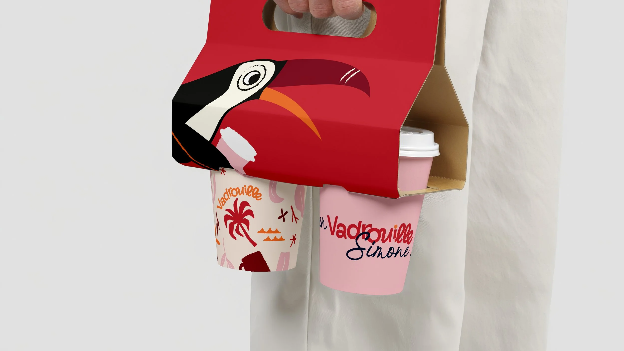 L’univers graphique joue avec les expressions de la route — en route, mauvaise troupe / en voiture Simone — et évoque le mouvement, l’évasion et les pays du café, sans oublier la douceur d’un moment cocooning autour d’un bon café et d’une pâtisserie maison. Le toucan, clin d’œil aux pays d’origine du café, devient la mascotte du voyage ! Vadrouille Café, c’est un café qui fait voyager, à savourer partout, comme à la maison.